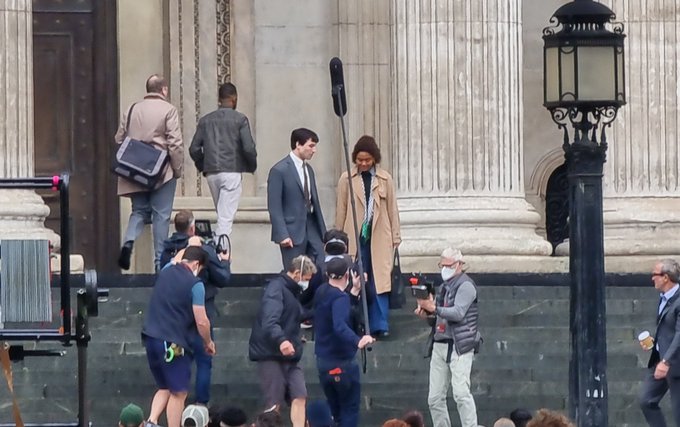 Along with the picture of Keaton in the tailored blue suit as Mr. Wayne, we get a little more look into this scene, seeing him speaking with Ezra Miller’s Barry Allen. as well what seems to be Bruce Wayne’s sleek new ride. No it’s not the Batmobile, but it’s definitely as badass as it. We also get see Barry is now wearing the Flash Ring. In Flash lore, Flash keeps his suit in a ring he wears, and it pops out in times of need for him to quickly jump into. We also get a shot of Keirsey Clemmons‘ Iris West Allen alongside of Barry. We finally got a quick look at Clemmons as the Flash’s love interest in Zack Snyder’s Justice League released on HBO Max earlier this year. Check out the batch of set photos below.